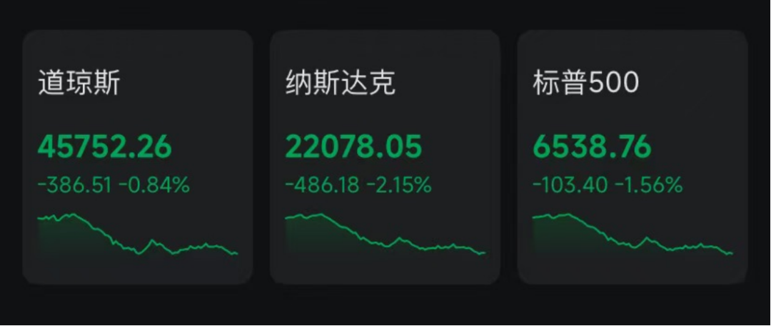 当地时间周四,美国三大股指全线收跌。截至收盘,道指跌0.84%报45752.26点,标普500指数跌1.56%报6538.76点,纳指跌2.15%报22078.05点。