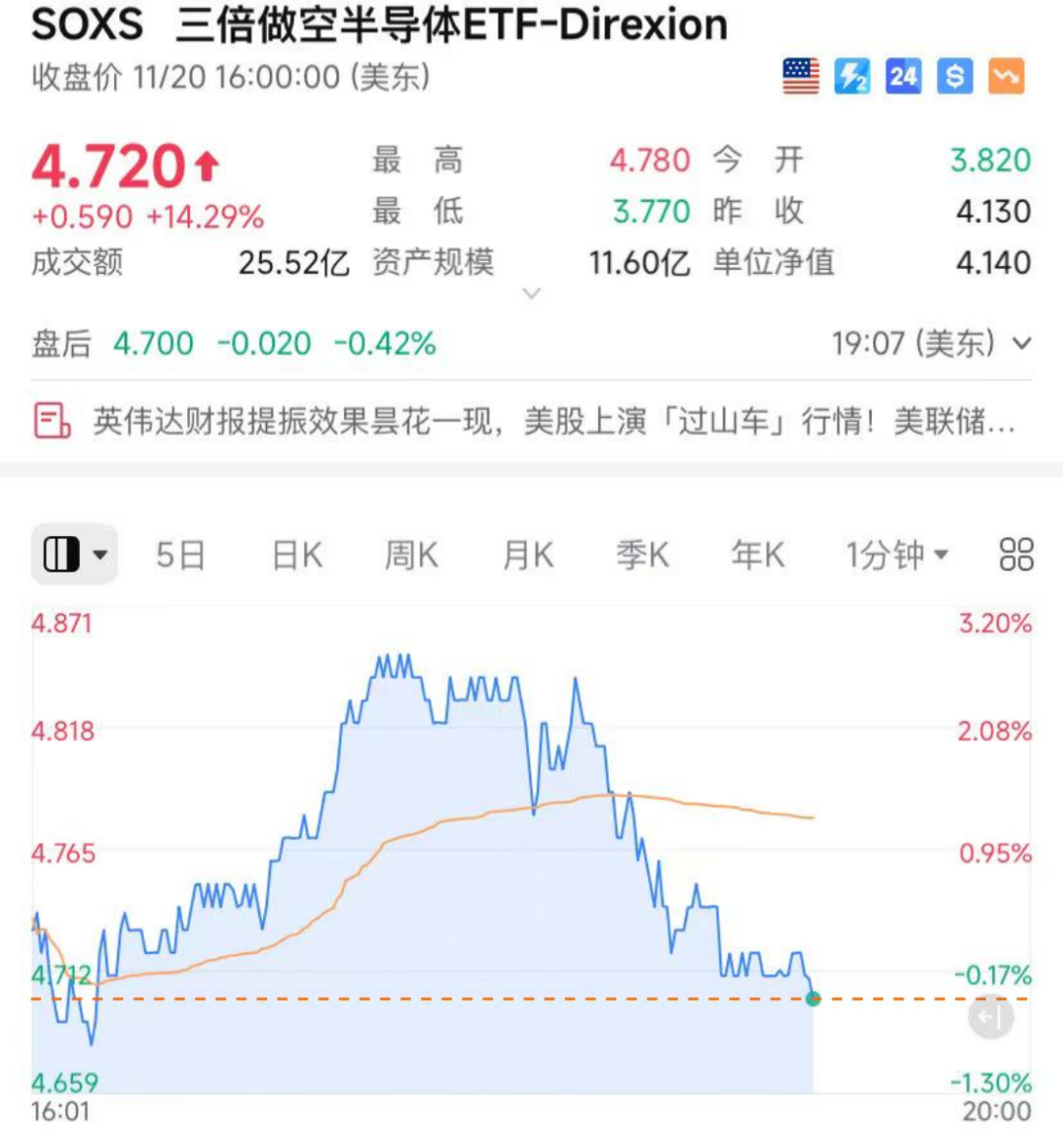 与此同时,三倍做空纳指ETF-ProShares涨超7%,三倍做空半导体ETF-Direxion涨超14%。