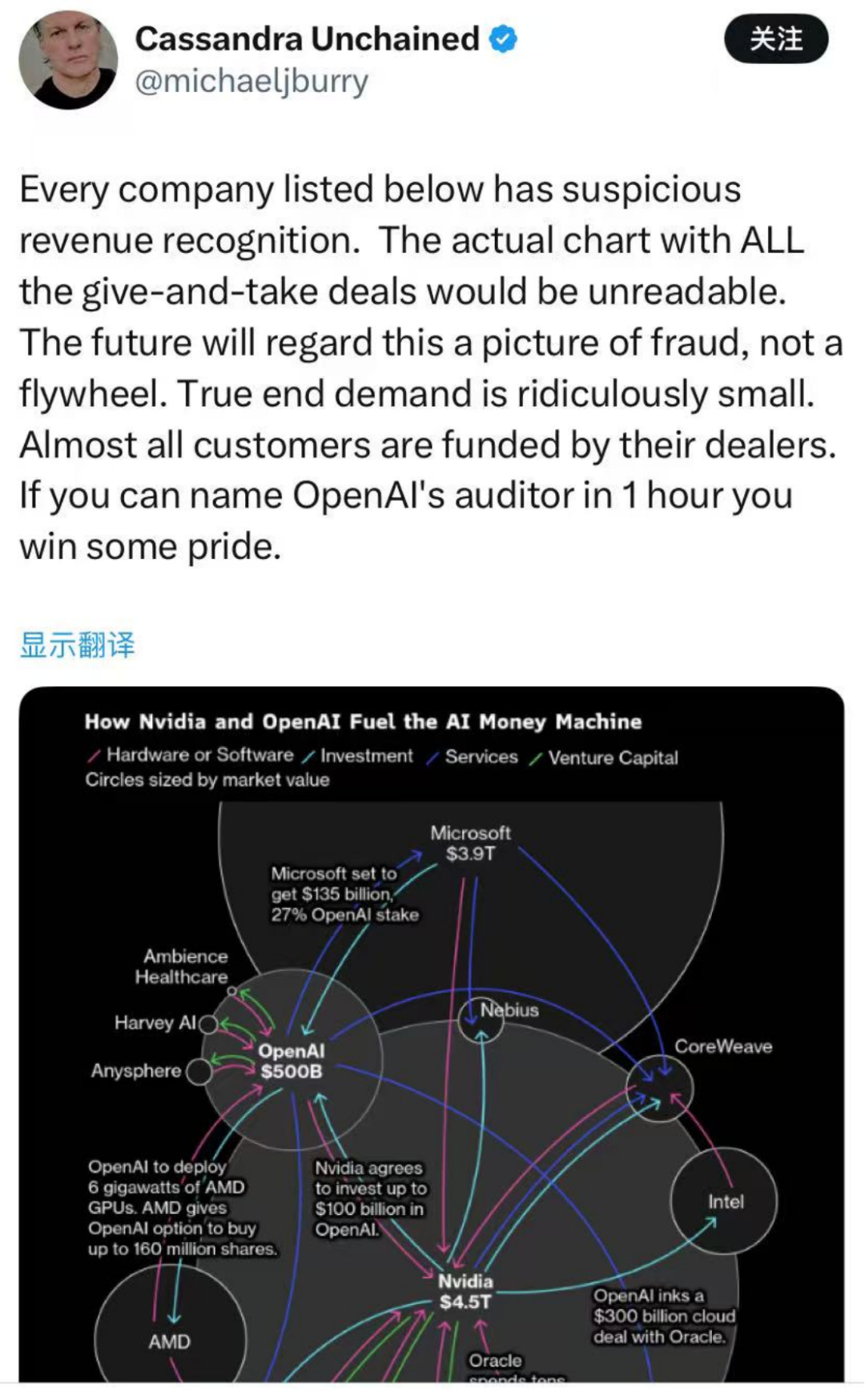 知名投资人Michael Burry则在社交平台再度发文,抨击AI泡沫。他表示:“下面列出的每家公司都存在可疑的收入确认问题。如果把所有交易都算进去,那图表简直难以辨认。未来人们会把这看作是欺诈,而不是飞轮效应。真正的终端需求少得可怜,几乎所有客户都是靠经销商出资的。”