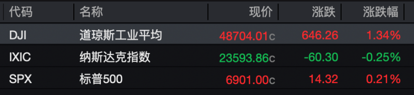 当地时间12月11日,美股三大指数涨跌不一,道指涨1.34%,纳指跌0.25%,标普500指数涨0.21%。大型科技股多数下跌,甲骨文财报不及预期致股价大跌超10%。中概股同样涨跌互现,纳斯达克中国金龙指数微跌0.09%。