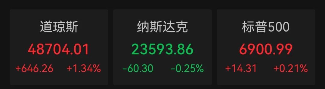 当地时间12月11日,数据显示,道指收涨1.34%,报48704.01点,刷新收盘纪录;标普500指数微涨0.21%,报6900.99点;纳指下跌0.25%,报23593.86点。
