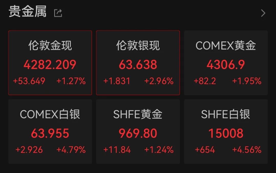 截至北京时间12月12日5:47,伦敦金现货价格涨1.27%,报4282.209美元/盎司;COMEX黄金期货价格涨1.95%,报4306.9美元/盎司。伦敦银现货价格大涨近3%,报63.638美元/盎司;COMEX白银期货大涨近5%,报63.955美元/盎司。